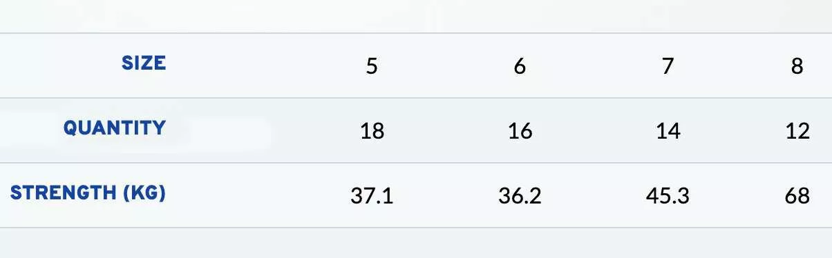 | Size Splitrings | #5, 32kg, 18Pack, #6, 36kg, 16Pack, #7, 45kg, 14Pack, #8, 68kg, 12Pack |